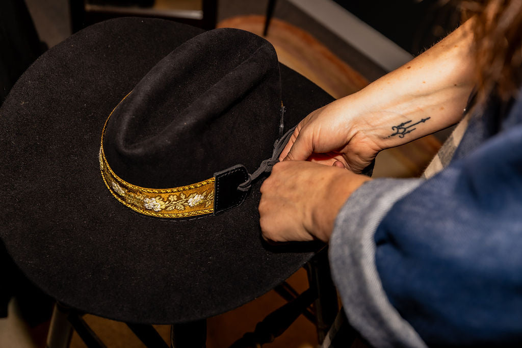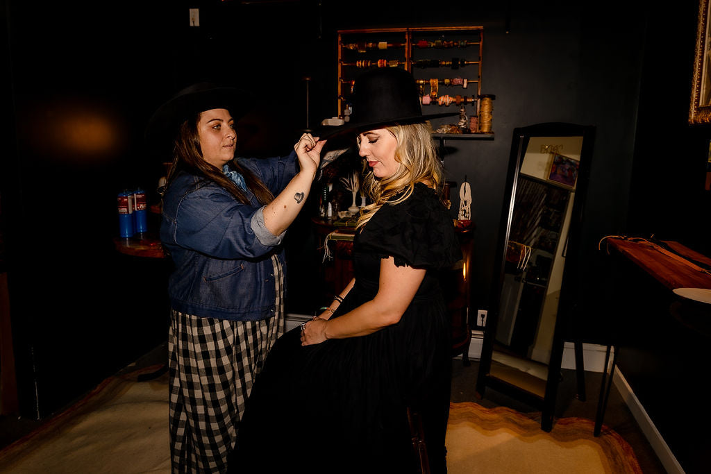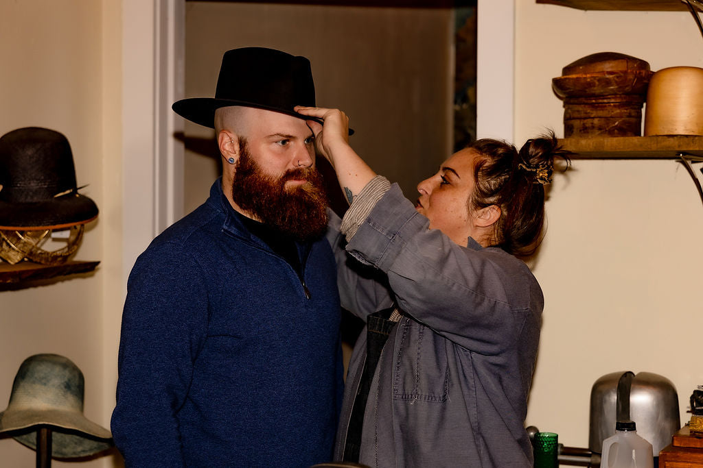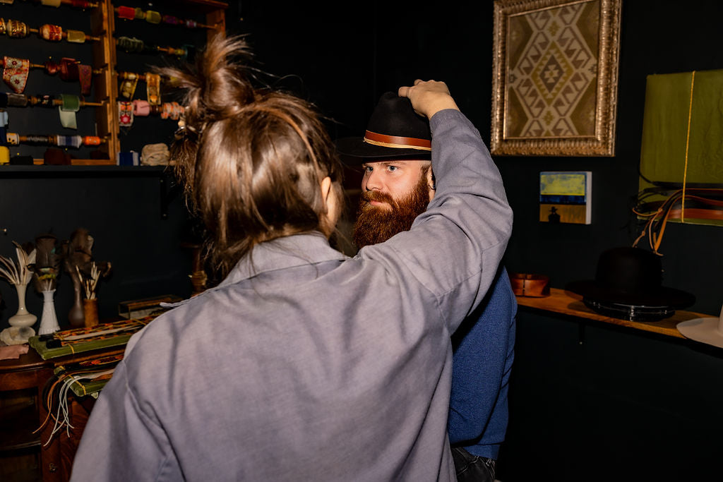 The recipient will have a custom hat appointment (in store or video chat) A custom fur felt hat will be sized, shaped and customized to their preference.