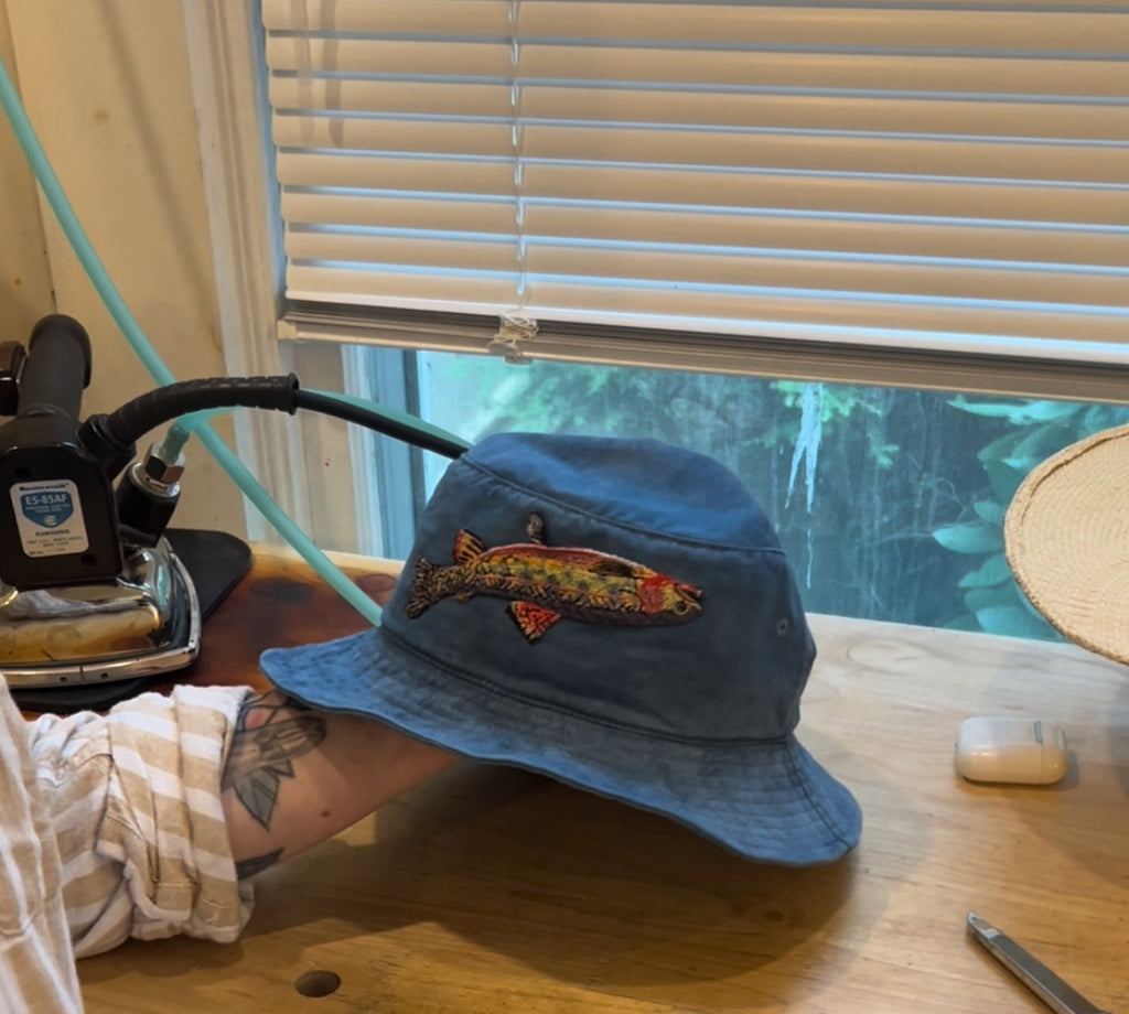 Hand dyed in organic indigo. This dead fish bucket hat has a convenient pocket for a joint or anything else with the same dimensions.